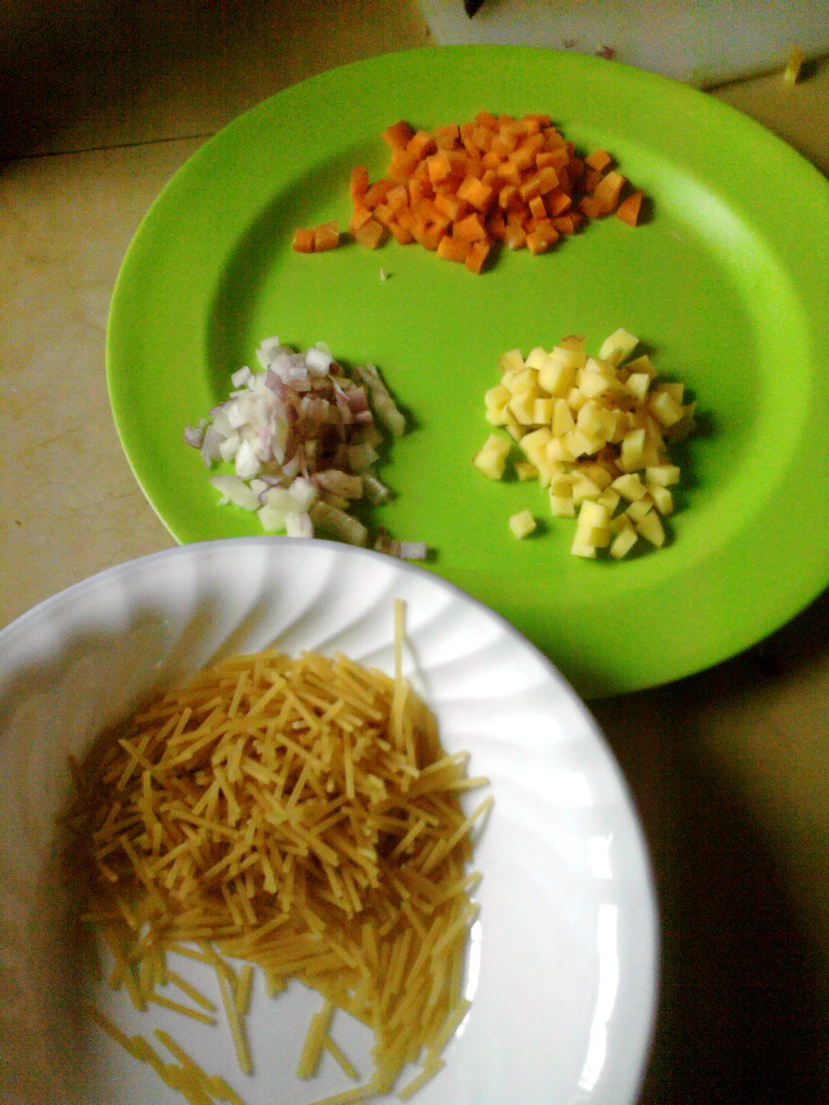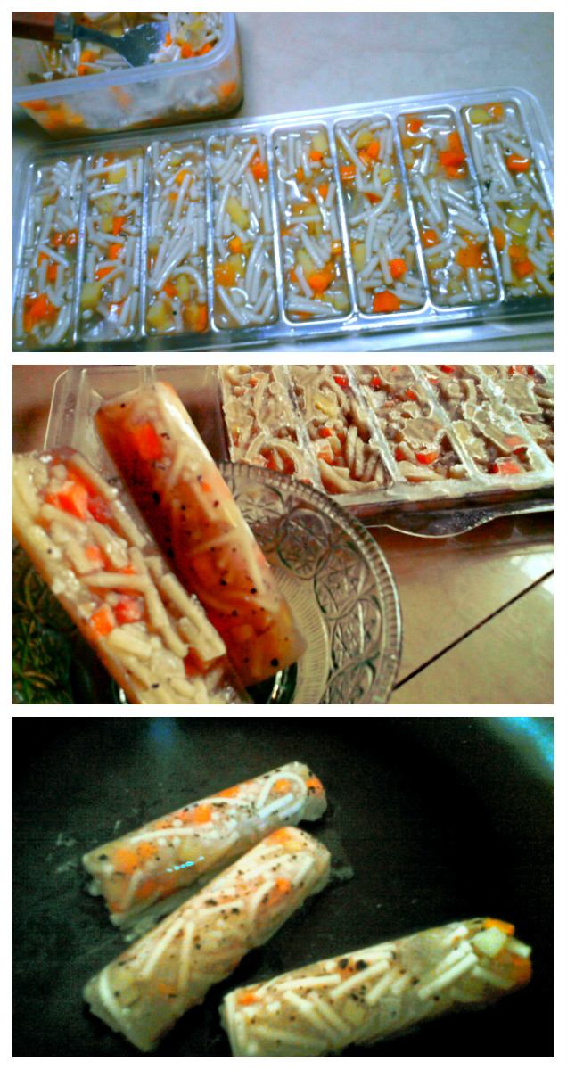 Chopped onion, potato, carrot plus 50 grams of uncooked pasta, broken into bite-size pieces.In a pot filled with water, toss everything in and cook over medium fire until pasta is cooked.I sprinkled black ground pepper to add flavor. Never salt (at this stage), but spices are okay.The rest were stored in the freezer. Following the storing process, I let the soup cool down before transferring into a lidded freezer tray.